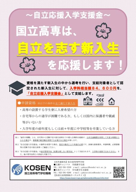 本校では、強固な意志をもって、地元や親元を遠く離れ、高専生活を通じ、見知らぬ土地で新たな知見を得ようと夢や期待を膨らませている皆さんが、経済的理由により仙台高専に通うことを諦めることのないように入学料相当額を給付し、応援する「自立応援入学支援金制度」を設けています。