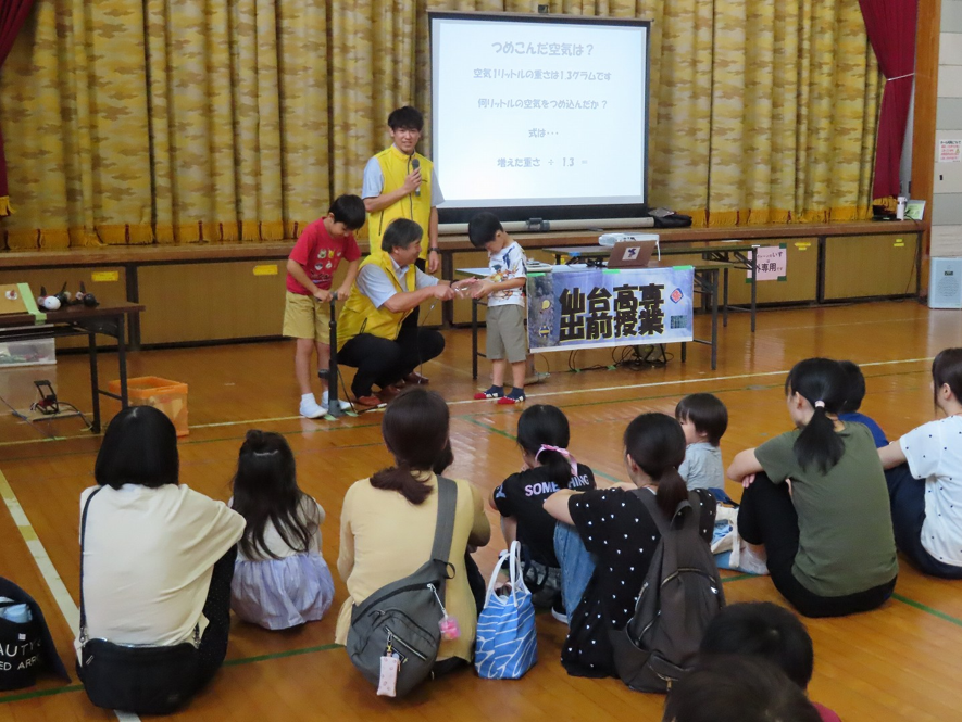 はじめに仙台高専の概要について紹介した後,空気には重さがあることを説明し,参加した児童と一緒に空気の重さを測定しました。その後,全員にペットボトルを配布し,雲を作る実験を行いました。雲ができる仕組みを説明したうえで,身近な生活の中で空気が利用されているものについて考えてもらいました。最後に,ペットボトルロケットに空気を詰め,空気の力だけで飛ばす実験を通して,空気が持つエネルギーを体験してもらいました。