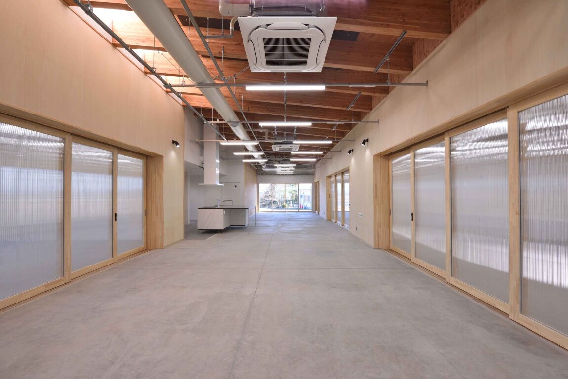 「情報と創造棟」は、高専キャンパスでは稀少な木造平屋のサスティナブルな教育拠点です。県産材の集成材による重ね梁構造で、コラボレーションスペースを中心とした開放的な大空間を実現しました。可動壁や木製サッシの開口を放つことで、各諸室と一体的な利用が可能となり、多様な活動に対応するフレキシブルな学びの場を構築しています。天窓や大開口からは自然光が降り注ぎ、高い断熱性能とともに一年中快適な環境を維持します。外装をガルバニウム鋼板で構成した建物はキャンパスのランドマークとなり、周囲の外部デッキとも連動。内外が一体化して活動が可視化される、情報と創造コースの新たな発信拠点として機能します。