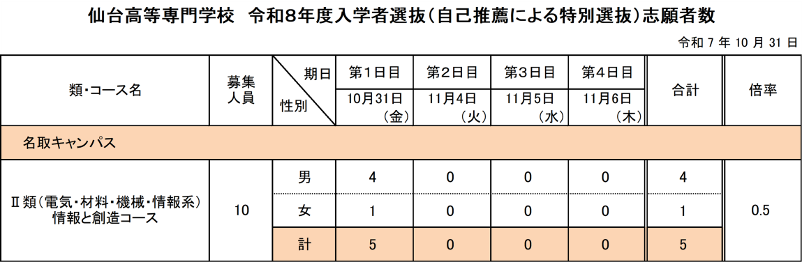 令和8年度入学者選抜(自己推薦による特別選抜)の出願状況