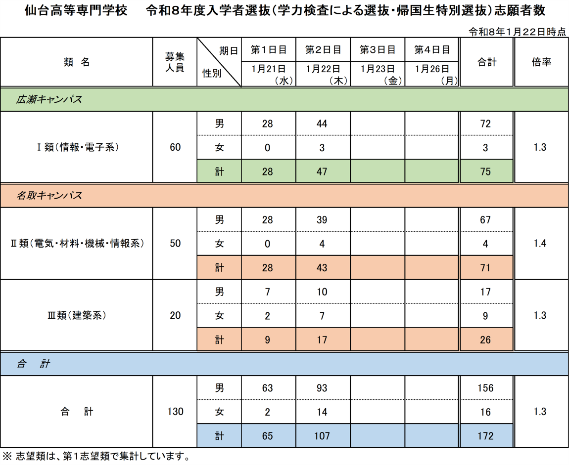 令和8年度入学者選抜(学力検査による選抜・帰国生特別選抜)の出願状況