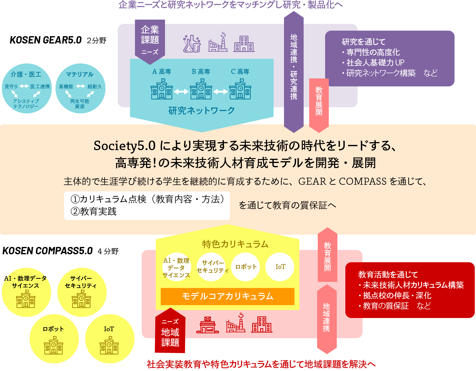 このような要請に応え,ICT を駆使した未来技術の中核となる人材を育成するために,高専機構全体としてのスケールメリットを最大限に活かした【高専発!「Society5.0 型未来技術人財」育成事業】をスタートし,この事業の中で,新時代に向けた取組みとして,研究分野では「GEAR5.0」(未来技術の社会実装教育の高度化),教育分野では「COMPASS5.0」( 次世代基盤技術教育のカリキュラム化)と定義し,高専全体のプロジェクトとして進めます。