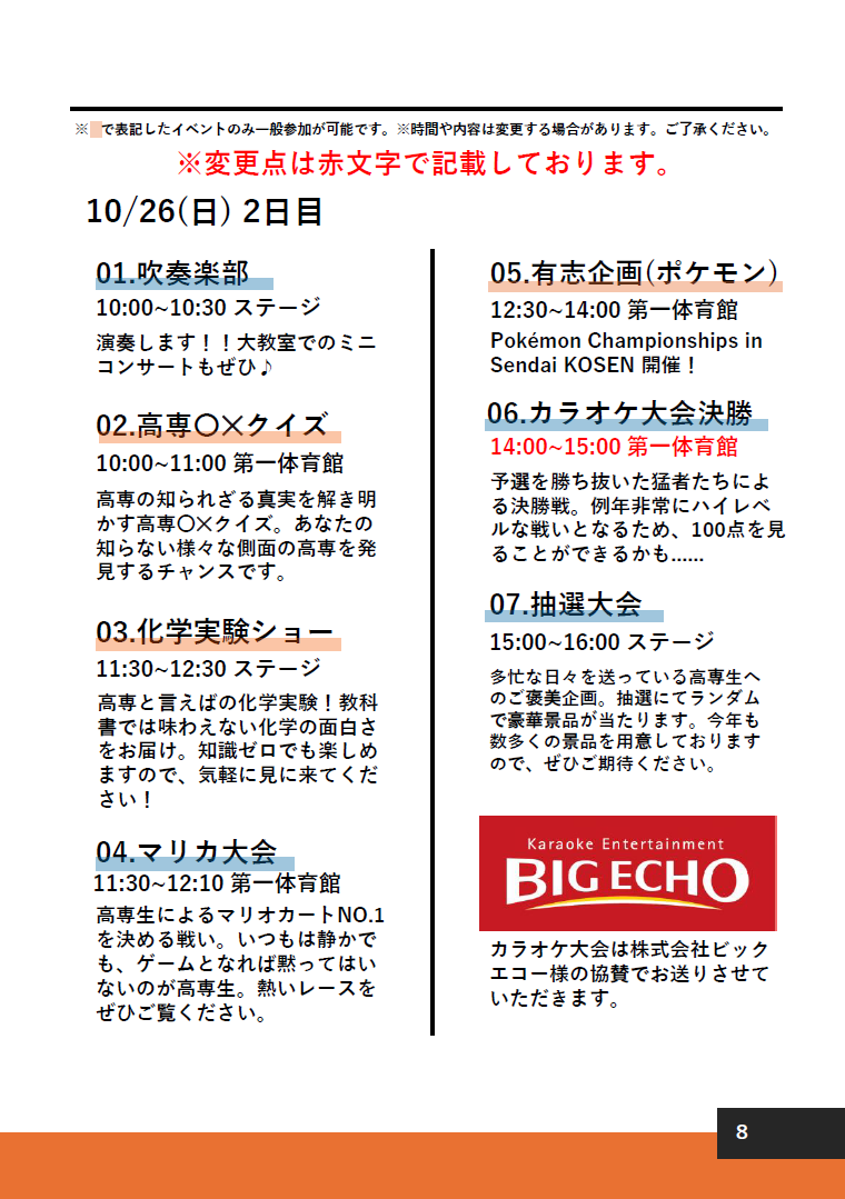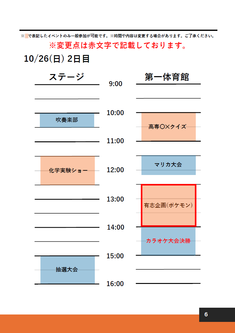 10月26日(日)高専祭2日目のスケジュールについて、雨天のため以下のとおり開催時間、場所が変更となりました。